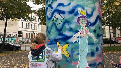 Seit den Herbstferien zeigen sich die zwei Litfaßsäulen an der Friedrich-Ebert-Straße im fantasiereichen Gewand. Die Kunstschule Richter in Connewitz hat die Motivsparten Paradiesgarten und Unterwasserwelt auf die 360° Grad-Panoramaleinwand gebracht: Spaziergänger können mit Fischen und Meerjungfrauen in die Meereswelt eintauchen und mit Blumen und Paradiesvogel wie Mary Poppins in einen Wundergarten versinken. „Wir freuen uns sehr über dieses spannende Kunstprojekt, das uns die Betreiber der QUARTERBACK Immobilien ARENA ermöglicht haben. Die Kinder gingen mit viel Freude ans Werk, die Litfaßsäulen auf ihre eigene Art und Weise mit Spraydosen und Acrylfarbe zu gestalten“, berichtet die engagierte Kunstpädagogin Christine Richter.