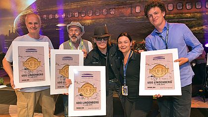 Udo Lindenberg hat in der ARENA LEIPZIG gestern Abend zum wiederholten Mal einen Sold-Out-Award erhalten. Vor Beginn seiner Show im Rahmen seiner Tournee 2019 nahm er die Auszeichnung von Matthias Kölmel (Geschäftsführer, ZSL Betreibergesellschaft mbH), Iris Rackwitz (Marketing- und Eventmanagerin, ZSL), Rüdiger „Sascha“ Sachse (Geschäftsführer, Känguruh Production Konzertagentur GmbH) und Roland Temme (Tourneeleitung, RTK Roland Temme Konzertveranstaltungsgesellschaft mbH & Co. KG) entgegen. Insgesamt 21.000 Tickets für beide Abende waren innerhalb weniger Wochen ausverkauft.
